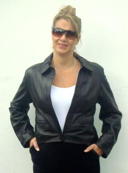 This sophisticated ladies hip length leather jacket is tailored to front and back, giving